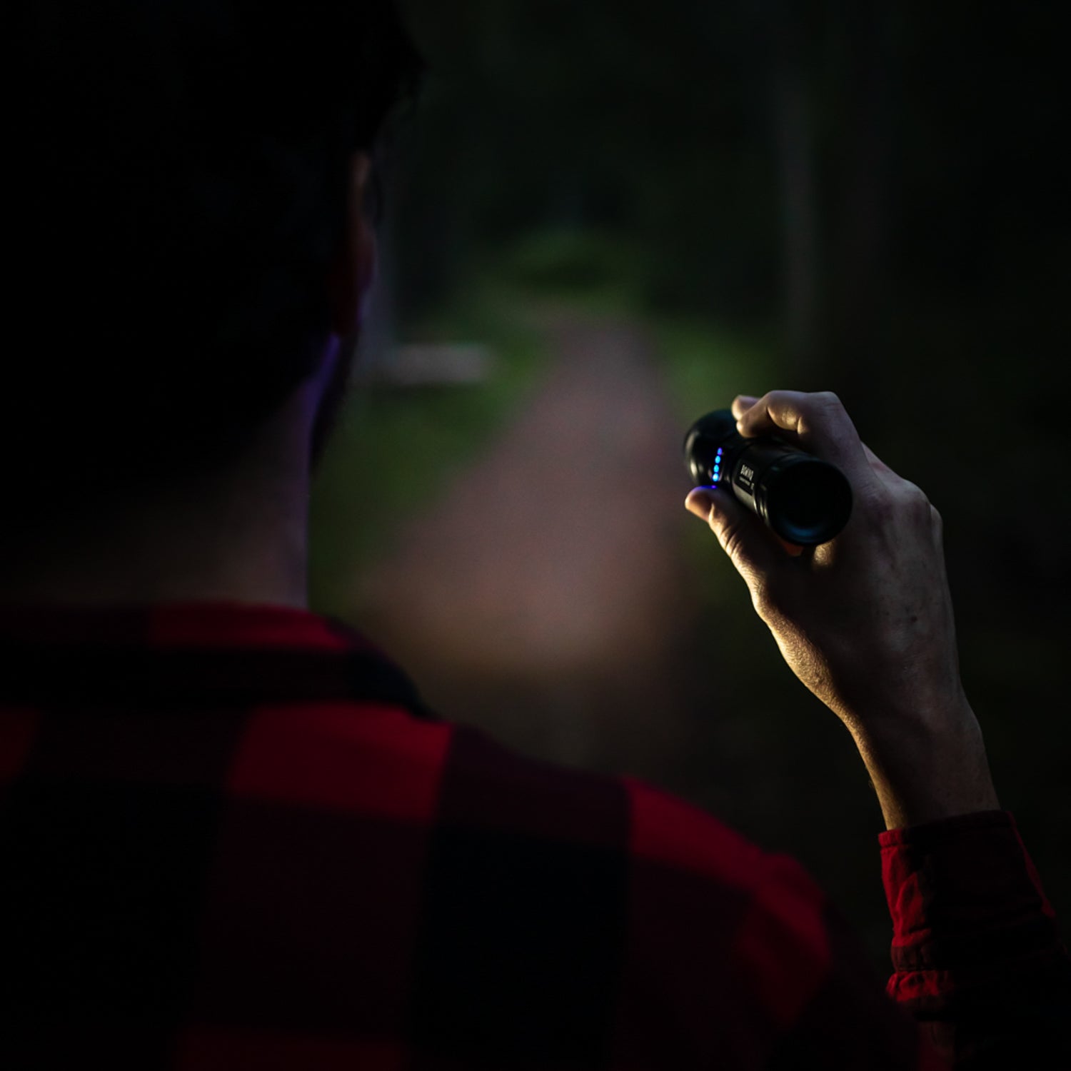 Diese Taschenlampe lässt sich einfach mit dem mitgelieferten Ladekabel über den USB-C-Eingang aufladen. Sie öffnen einfach die wasserdichte Abdeckung und das USB-Ladekabel kann eingesteckt werden. Darüber hinaus verfügt diese wiederaufladbare Taschenlampe auch über einen USB-Ausgang, über diesen Anschluss können Sie beispielsweise Ihr Smartphone über die Taschenlampe aufladen. Über der Ein-/Aus-Taste befinden sich 4 Anzeige-LEDs; Jede LED repräsentiert 25 % der Batterie.